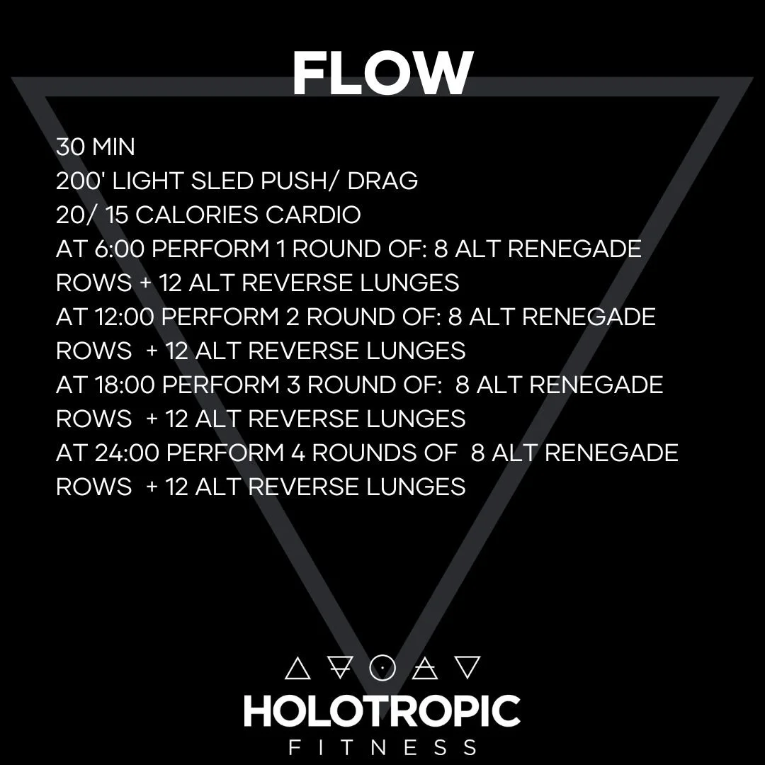 The main event starts with a lighter push/ drag followed by easy cals on cardio of choise. At each 6 minute mark, this couplet will be interupted by renegade rows and alternating lunges. Choose moderate weights for these that allow a quick transition and leaving reps in the tank. Each subsequent 6 minute mark, add a round of rows and lunges. Continue until you reach the 30 min