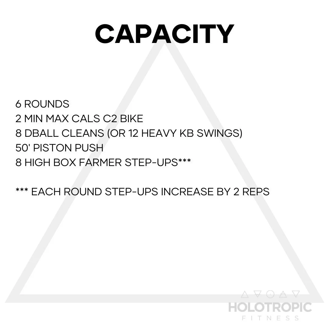 Start the round on the bike pushing to maintain a working pace and not using it to coast. Keep the cleans or KB swings explosive and then move into a moderate to heavy piston push that will challenge you but that you are able to do unbroken. The high step ups should be HIGH with no load, but using effort to get up to stand. These will go up by 2 reps each round.