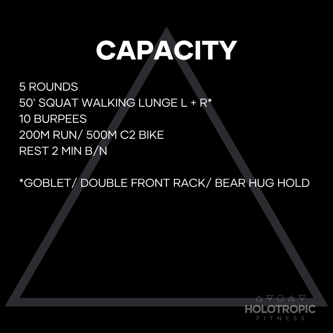 Pairing a front loaded squat with a lunge on each side for 50’ (or 20 reps) is incredibly challenging on not only the legs, but also the core and shoulders. Choose a load that challenges you but that you can complete the set without failing. Move right into a set of quick burpees and then a hard push on cardio before resting.
