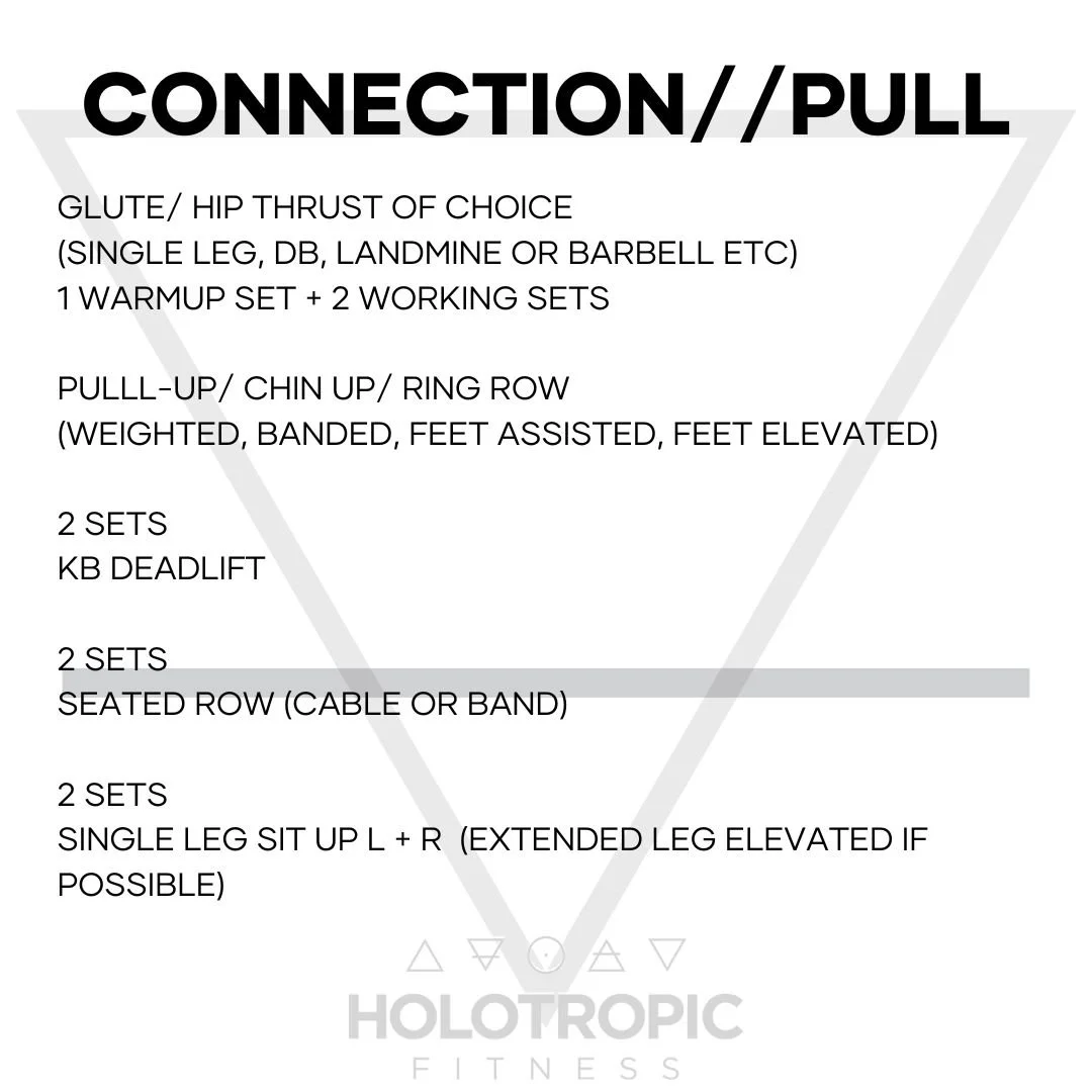For accessory, KB Deadlifts should be performed with a kettlebell on either side of the body, focus on a more narrow stance. The seated row can be performed on a cable machine with traditional close grip handle or experiment with a wide grip. Alternative is to use a band or banded dbs. Lastly single leg situps can be performed with the extended leg on the floor or elevated as a more advanced variation.