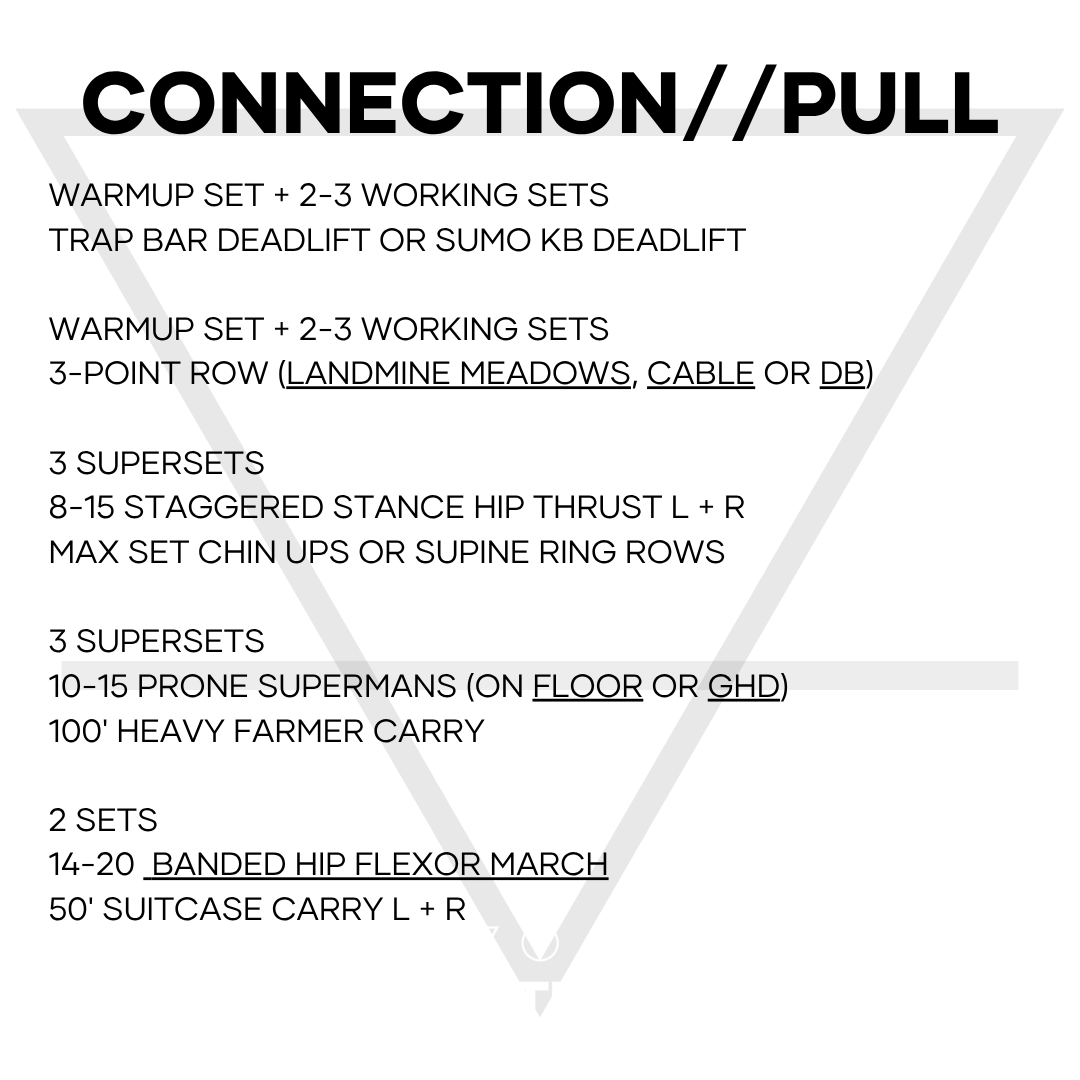 This month's pull will focus on a trapbar or sumo deadlift as the lower body strength movement. Options can include banding the trap bar or KBs as well as using cable or sumo with barbell.