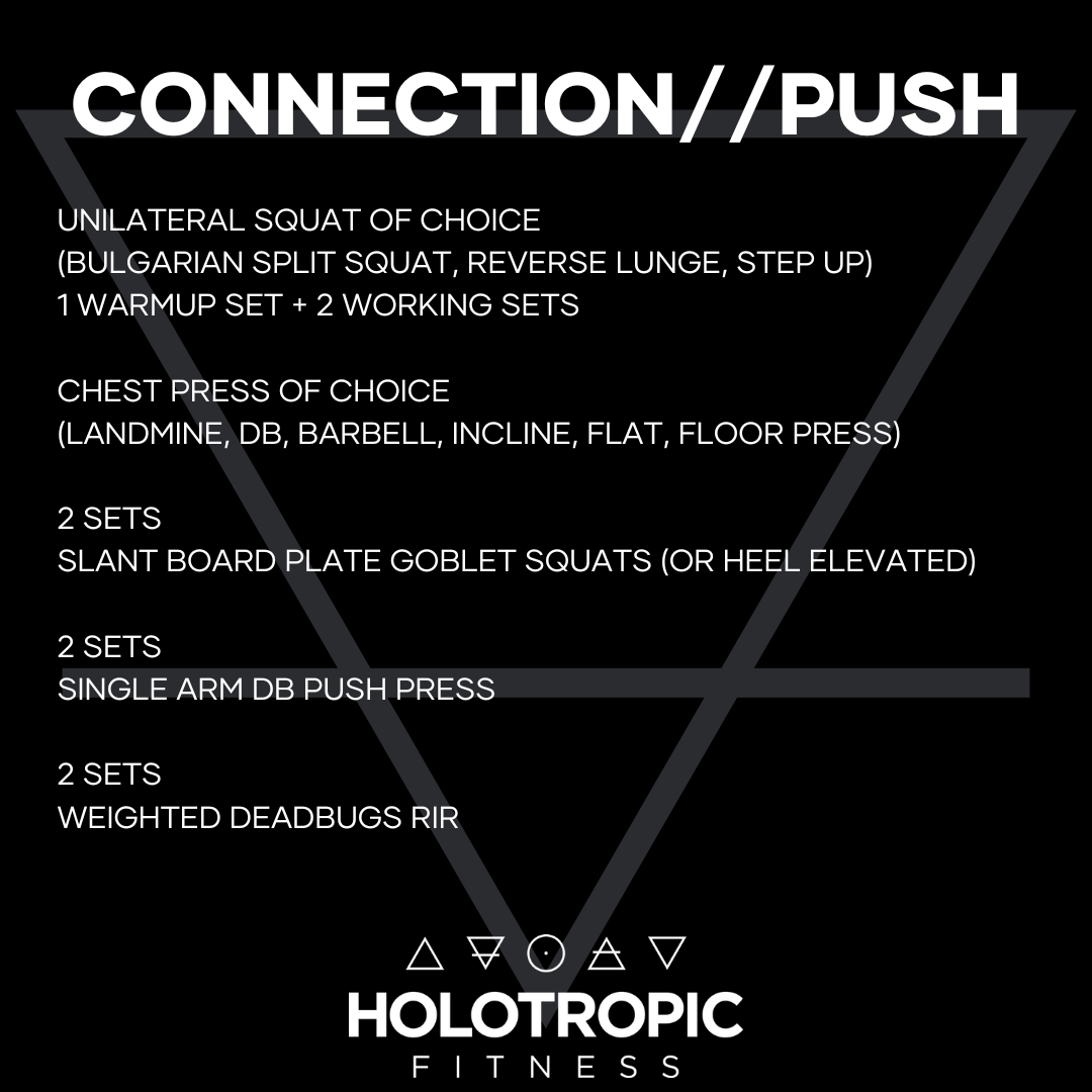 Push press should be done with good mechanics stopping the set when you begin to deviate or only have 1-2 reps remaining. Weighted deadbugs are slow and controlled