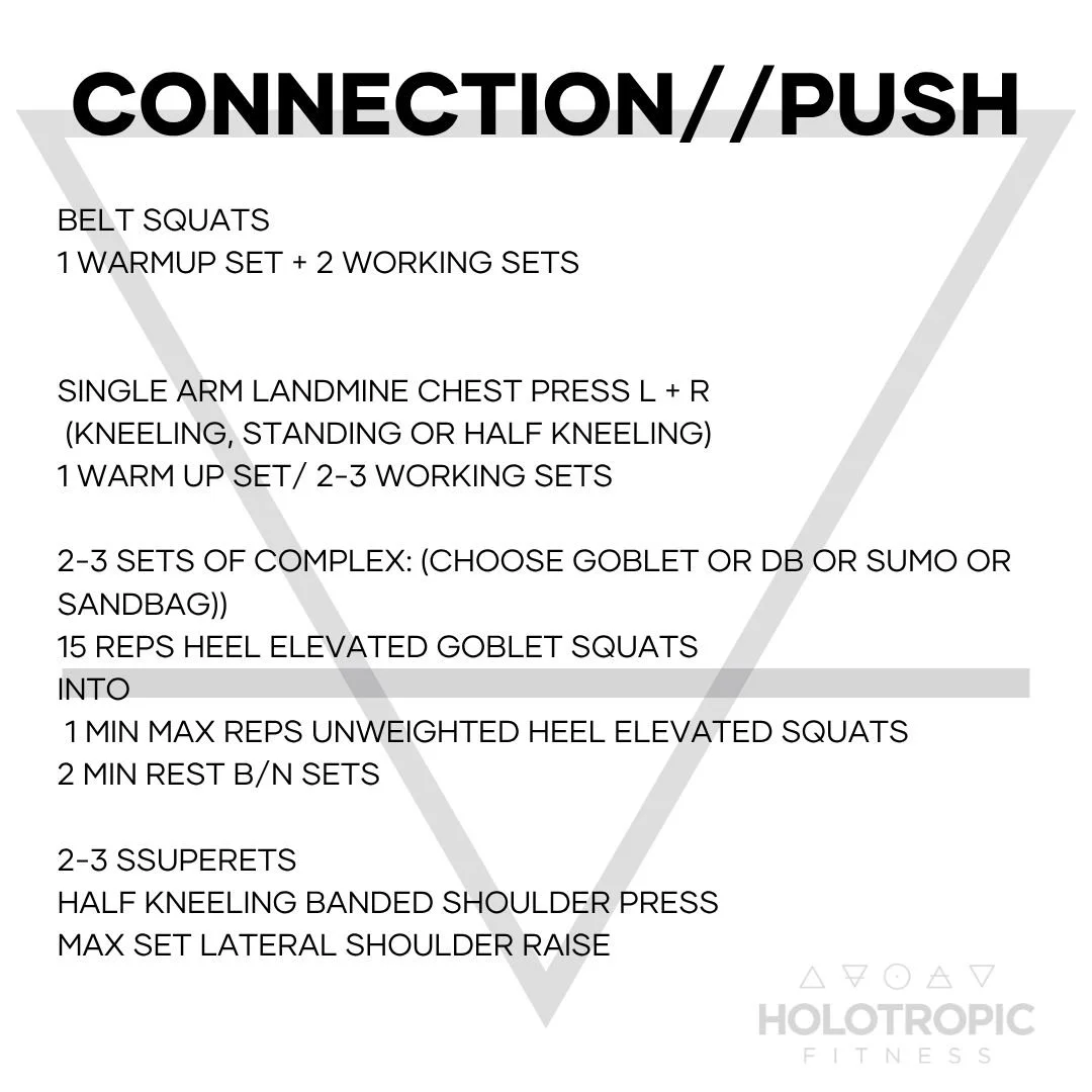 For accessory: get ready for this lower body complex... it's going to be a quad burner. Start with a set of controlled goblet squats with heels elevated ona. 35-45# plate. Move immediately into 1 mini of max reps without any load. Rest 2 min b/n sets.